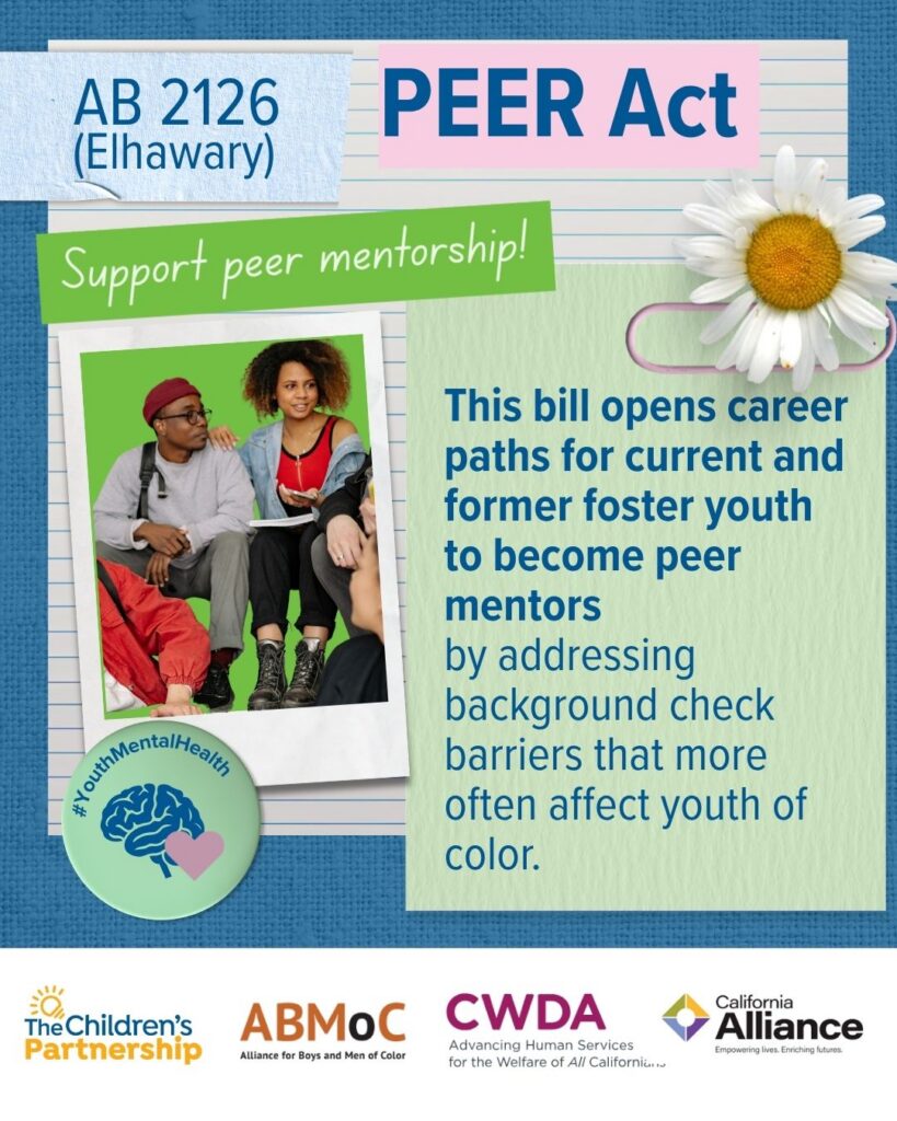 In 2026, the Children’s Partnership is co-sponsoring the Peer Employment Equity Reform (PEER) Act, AB 2126, as part of our children’s health equity policy agenda. The PEER Act, authored by Assemblymember Sade Elhawary (D – Los Angeles), is a step forward for current and former foster youth to get job opportunities as peer mentors.