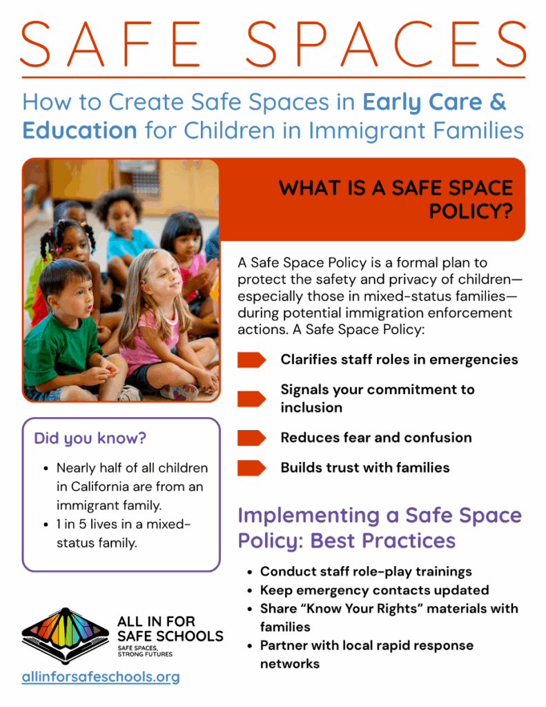 ALL IN For Safe Schools is excited to share our newest resource for California’s early care and education providers: a one-pager titled “How to Create Safe Spaces in Early Care and Education for Children in Immigrant Families.”