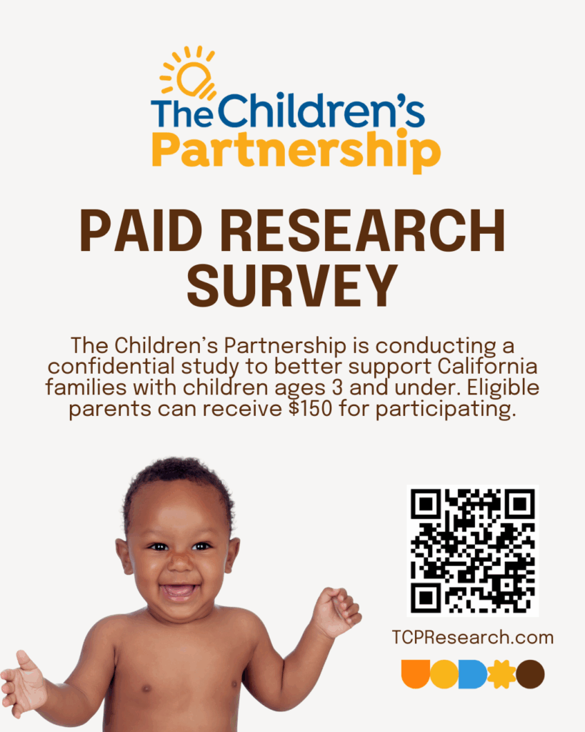The Children’s Partnership (TCP) is conducting a confidential, anonymous online study of California parents with children ages 3 and under to learn how to better support families statewide. The information will be kept safe—not shared outside the research team, and used to inform TCP’s advocacy to support the needs of families of young children from diverse backgrounds. There are multiple online studies available. Participating parents of children ages 3 and under will receive $150 for their time! Click here to take a short survey to be considered for the study: TCPResearch.com.