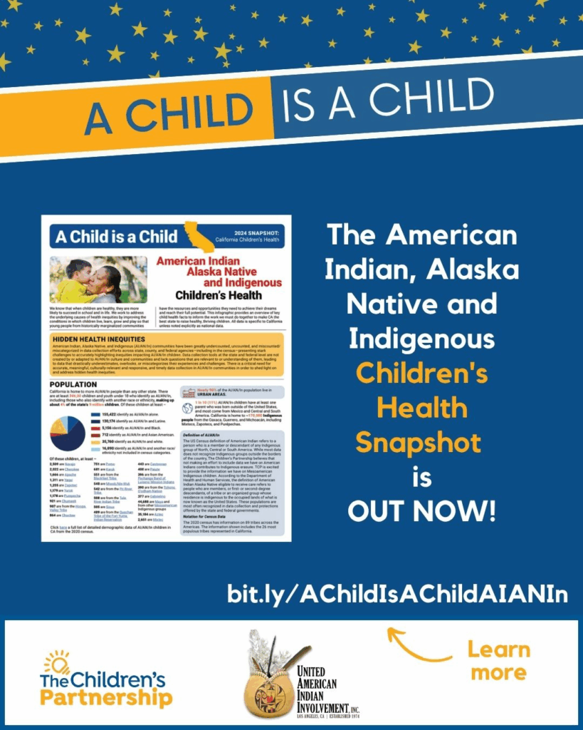 In collaboration with The California Consortium for Urban Indian Health and United American Indian Involvement, we shine a spotlight on the health challenges of over 346,000 American Indian, Alaska Native and Indigenous children in California. Recognizing the historical impact of colonization and genocide on Indigenous cultures, we acknowledge our responsibility to address persistent harm to children and families – and hope our fact sheet helps in that effort.