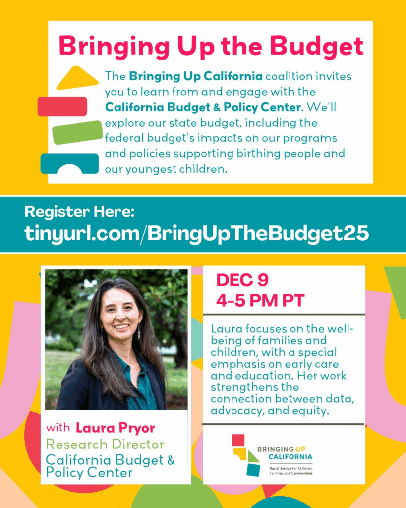 The Bringing Up California coalition invites you to join us at our next meeting featuring special guest Laura Pryor, research director at the California Budget & Policy Center.